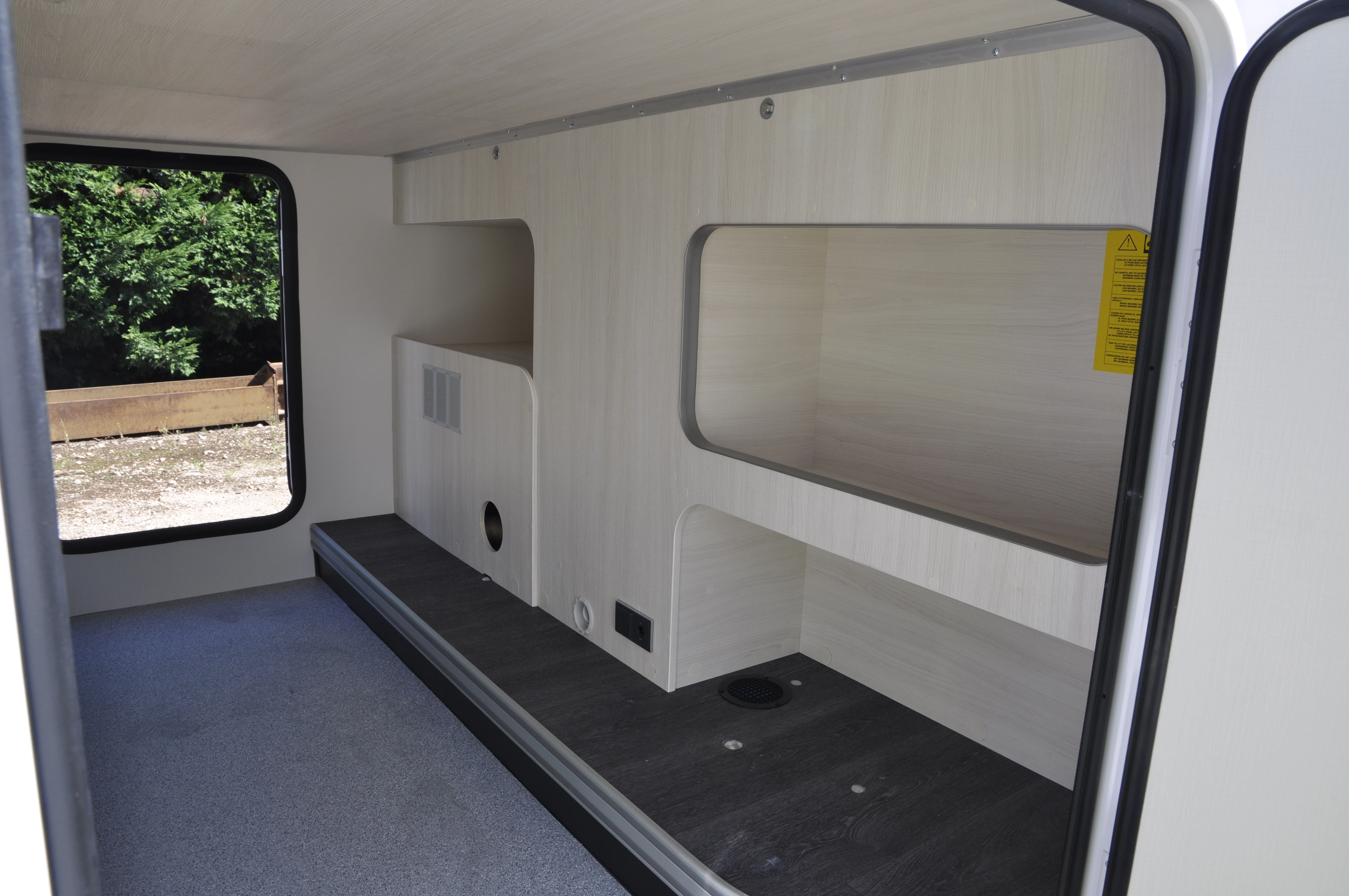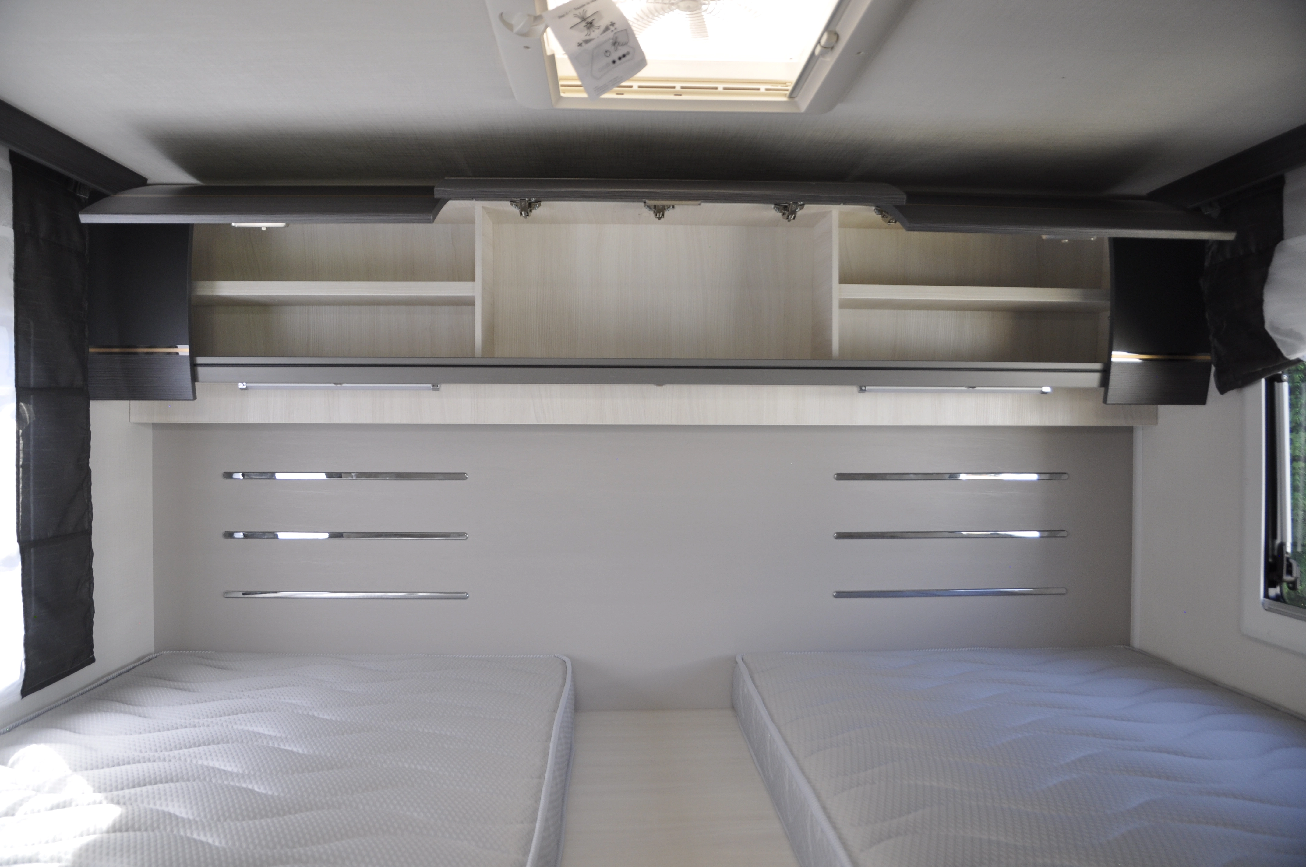 De camper heeft een ruime zithoek, waarbij de twee voorstoelen kunnen worden omgedraait, waardoor er plaats is voor 5 personen. Deze rondzit kan worden omgebouwd tot bed door het verlagen van de tafel. Bovendien hangt er boven de zithoek een elektrisch bedienbaar hefbed. Aan de achterzijde van de camper bevinden zich twee enkele bedden, waarbij je in de lengte slaapt. Door middel van een tussenstuk kan hier een ruim drie persoons bed van worden gemaakt. Onder dit bed bevindt zich een grote garageruimte. De badkamer heeft een aparte douche en toilet ruimte. Het keukenblok is voorzien van een ruime 141L koelkast, een 3-pits kookplaat en ladekasten voor optimale bergruimte.