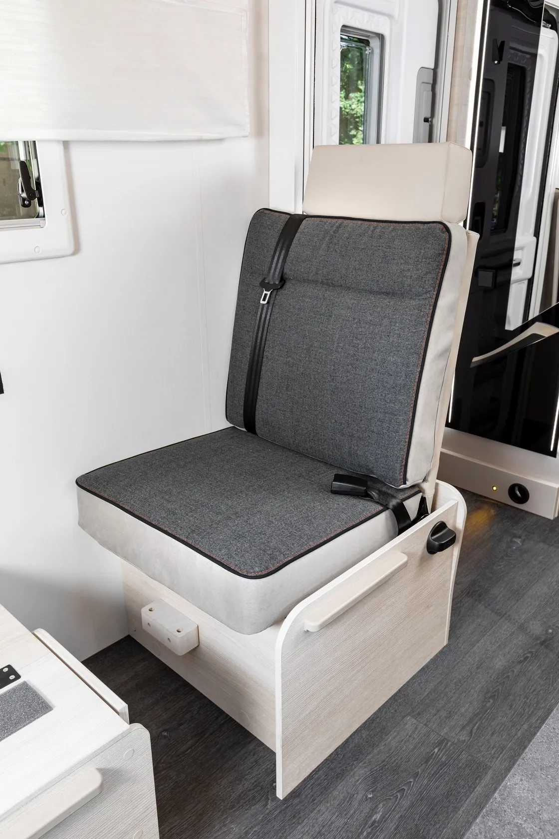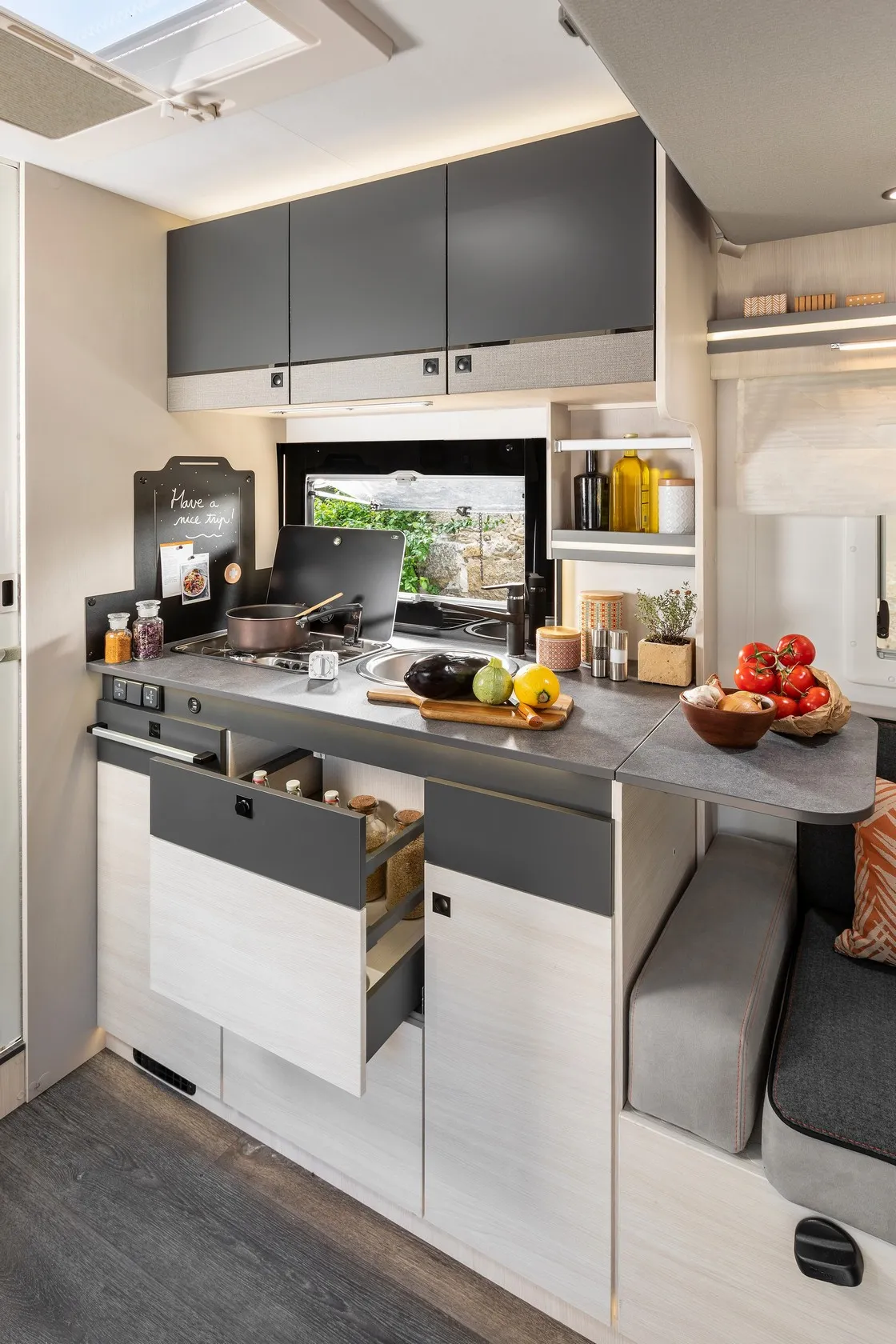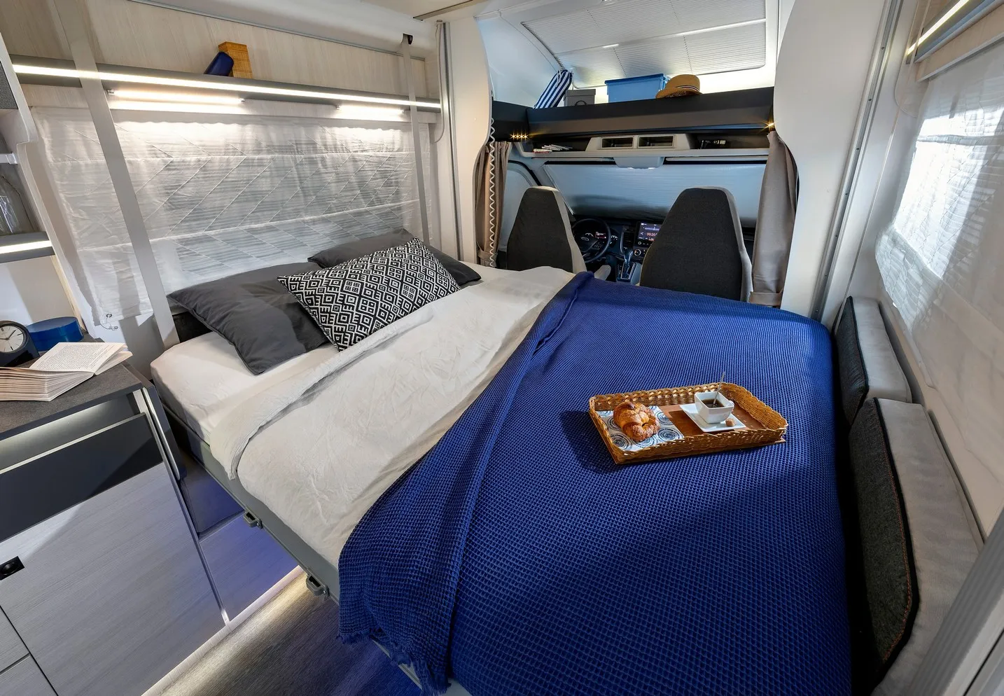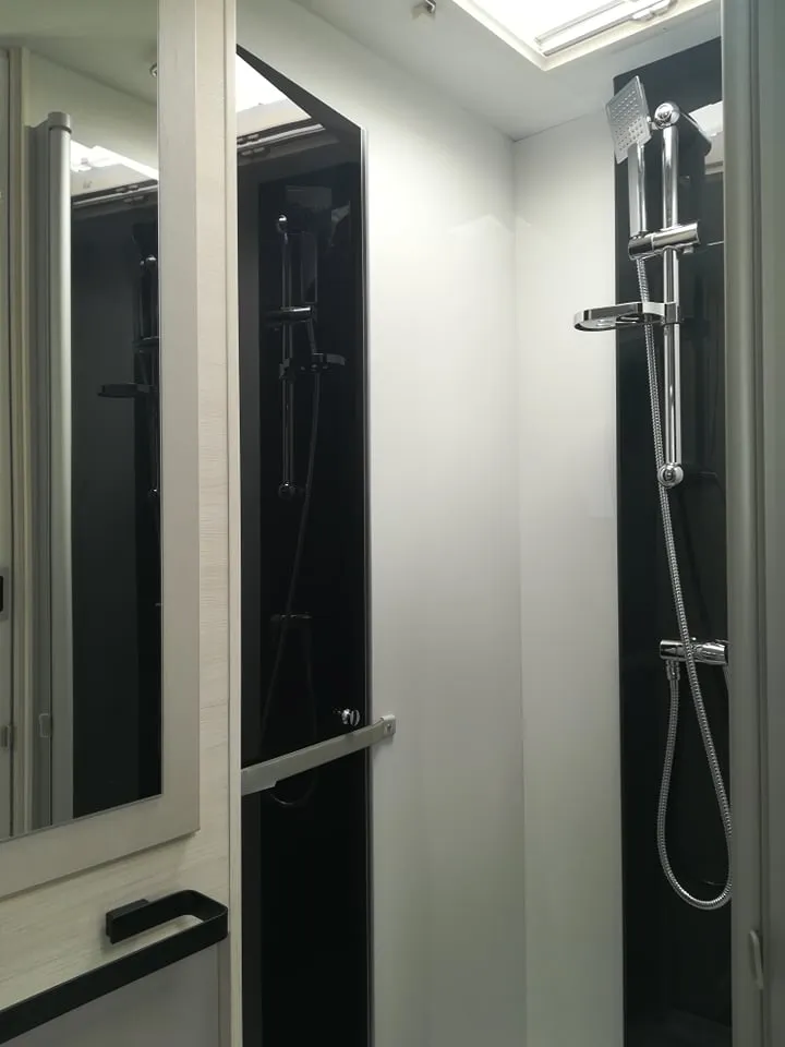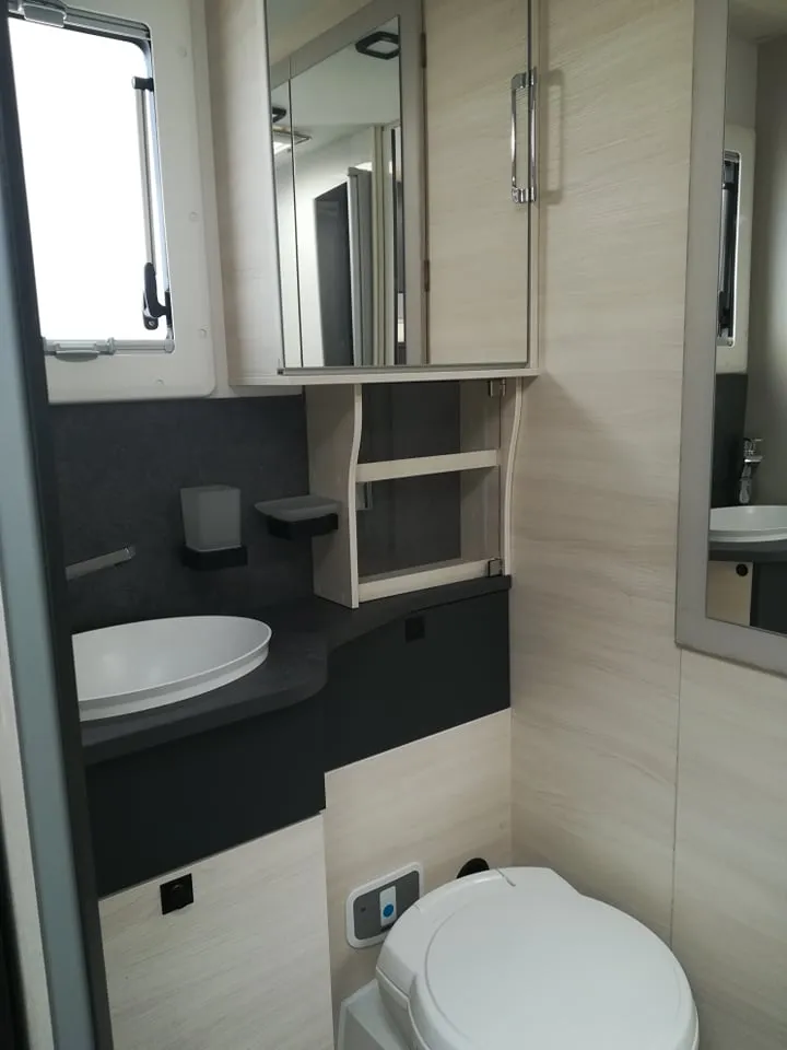 De camper heeft een ruime maxilounge met 2 banken tegenover elkaar waarbij de twee voorstoelen kunnen worden omgedraait, waardoor er plaats is voor 4 personen (4 gordels). De zitgroep is om te bouwen tot extra bed welke geschikt is voor 2 personen. Het luxe hefbed dat boven het zithoek hangt kan tot op de zitbank dalen zodat u een makkelijke instap in het bed heeft. Door deze halverwege te hangen, creëert u een groot stapel bed met de omgebouwde zitgroep. De badkamer is een gescheiden douche- en toilet ruimte welke door ingenieuze indeling te combineren zijn tot grote badruimte, ook bevindt zich achter de spiegel een hangkast. Direct onder de hangkast heeft de camper een grote bergruimte welke van binnen en buiten te bereiken is. Voor de badkamer staat het keukenblok, welke voorzien is van een zeer ruime koelkast, een 2-pits kookplaat, en opbergruimte.