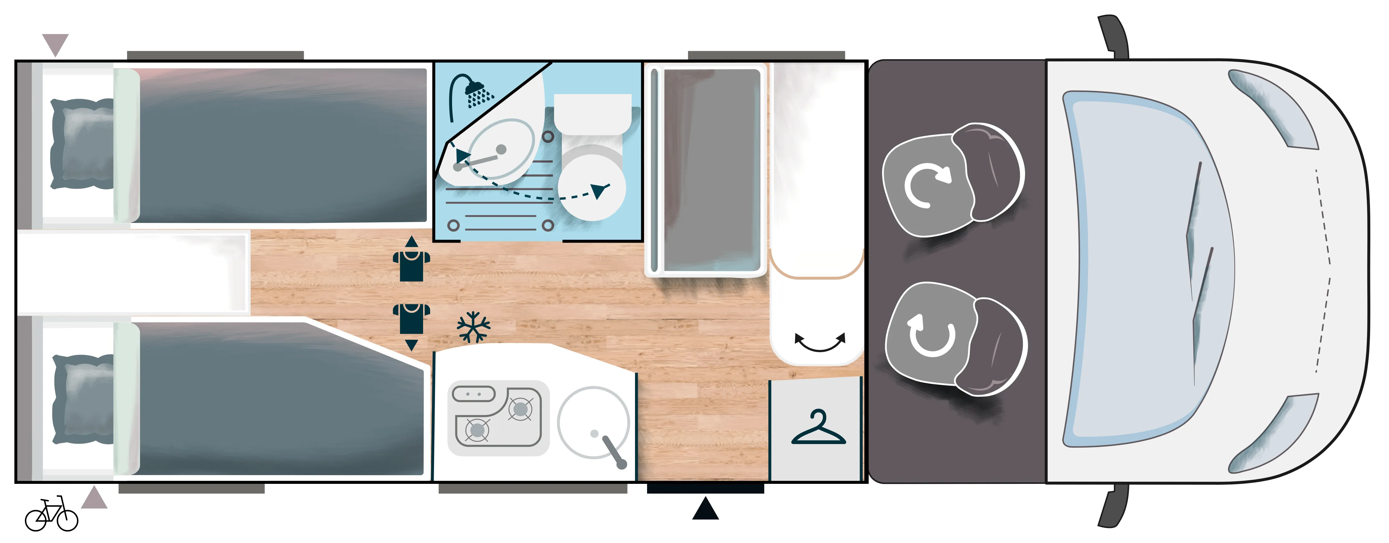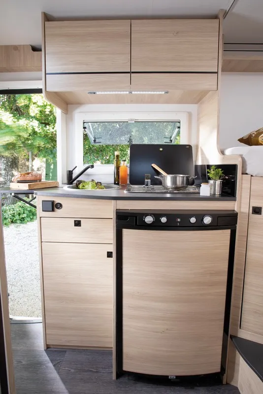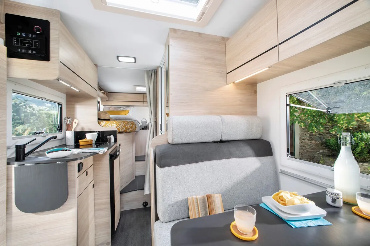 De camper heeft een praktische zithoek, waarbij de twee voorstoelen kunnen worden omgedraait, waardoor er plaats is voor 4 personen. Deze zit kan worden omgebouwd tot extra kinderbed door het verlagen van de tafel. Aan de achterzijde van de camper bevinden zich twee enkele bedden, waarbij je in de lengte slaapt. Door middel van een tussenstuk kan hier een ruim drie persoons bed van worden gemaakt. Onder dit bed bevindt zich een grote garageruimte. De badkamer heeft een ingenieuze douche en toilet ruimte. Het keukenblok is voorzien van een 87L koelkast, een 2-pits kookplaat en diverse kasten voor optimale bergruimte.