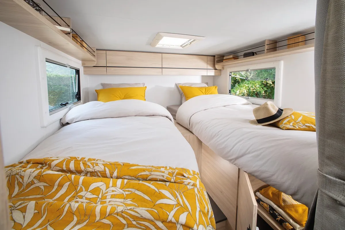 De Chausson S697 titanium heeft een comfortabele indeling met twee enkele bedden of een groot kingsize bed. Deze camper is compact dankzijn zijn breedte van 2,10 en lenget van 6,59 en beschikt toch over 2 enkele bedden en een garage bergruimte.