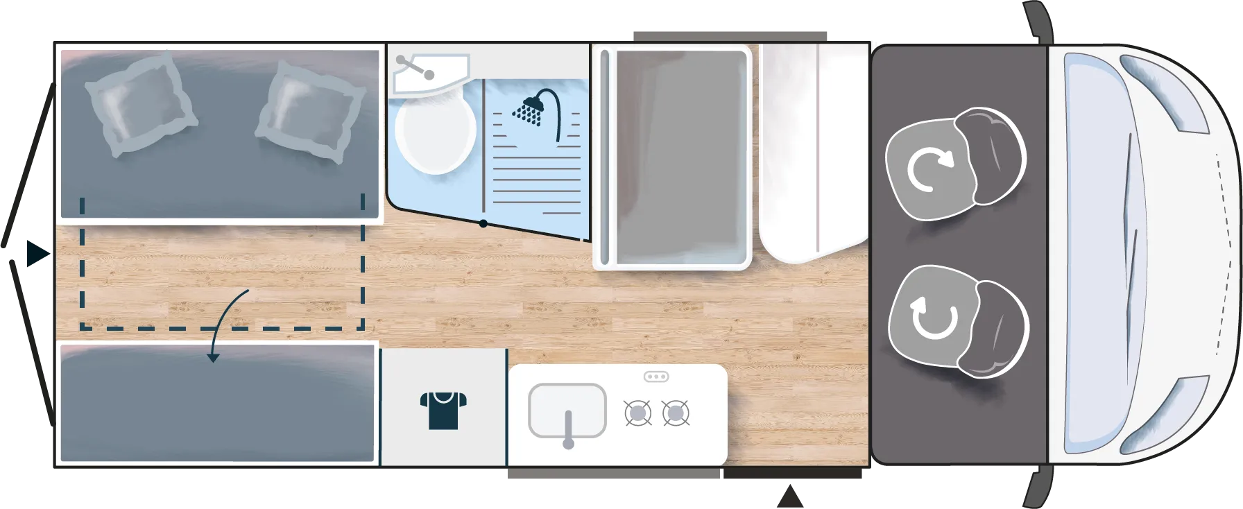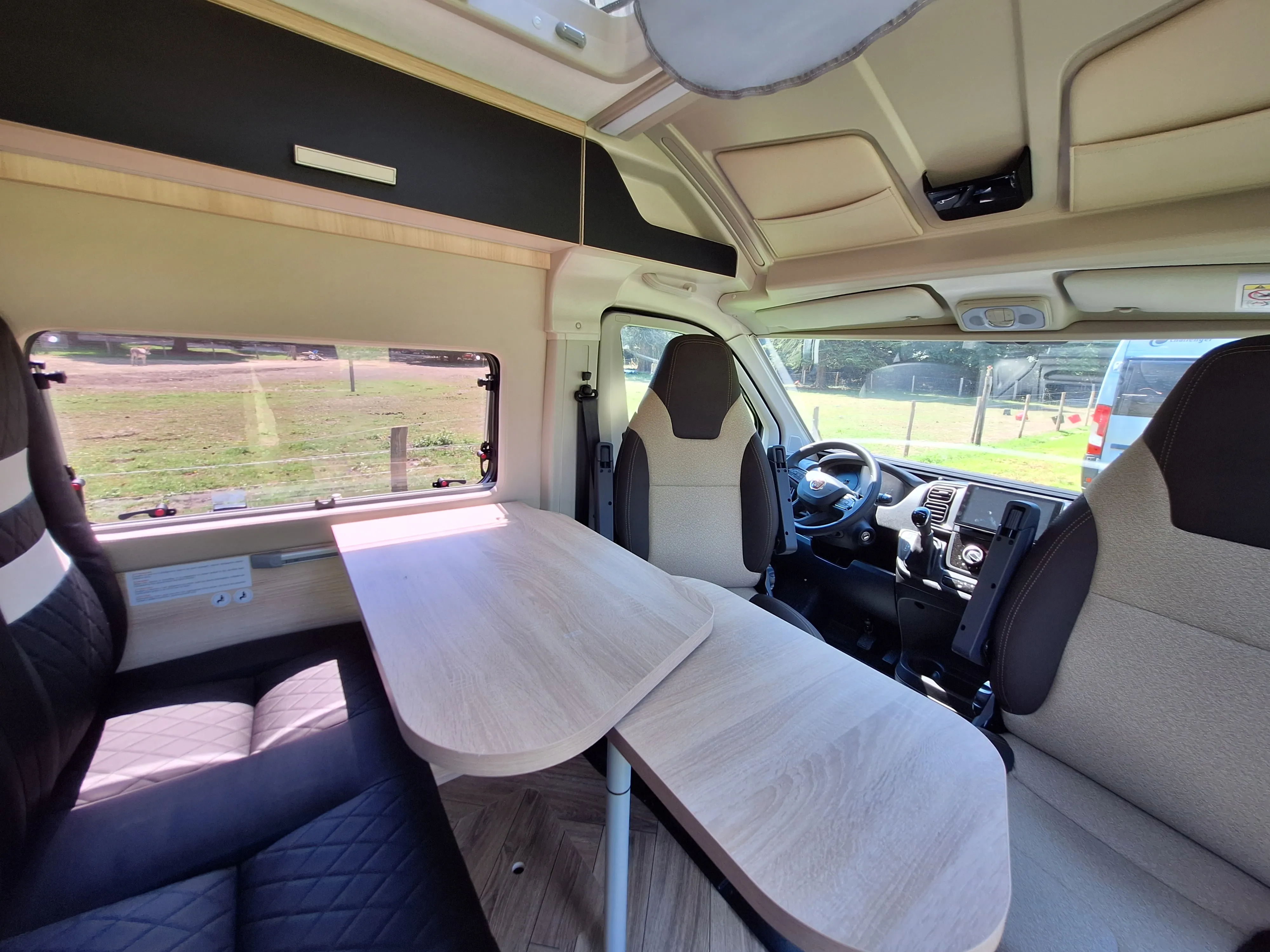 De camper heeft een standaard zithoek, waarbij de twee voorstoelen kunnen worden omgedraaid, waardoor er plaats is voor 4 personen. Deze rondzit is eventueel om te bouwen tot een klein kinderbed door het verlagen van de tafel. Aan de achterzijde van de camper bevindt zich een 2-persoons bed overdwars. Onder dit bed is de bergruimte, welke van buiten en binnen te bereiken is. Het is ook mogelijk om het bed op te klappen tot zijbank waardoor deze bergruimte volop benut kan worden. De badkamer heeft een gecombineerde douche en toilet combinate, hoewel douchen in deze camper niet ideaal is. Het keukenblok is voorzien van een 85L koelkast, een 2-pits kookplaat en ladenkasten voor optimale bergruimte.