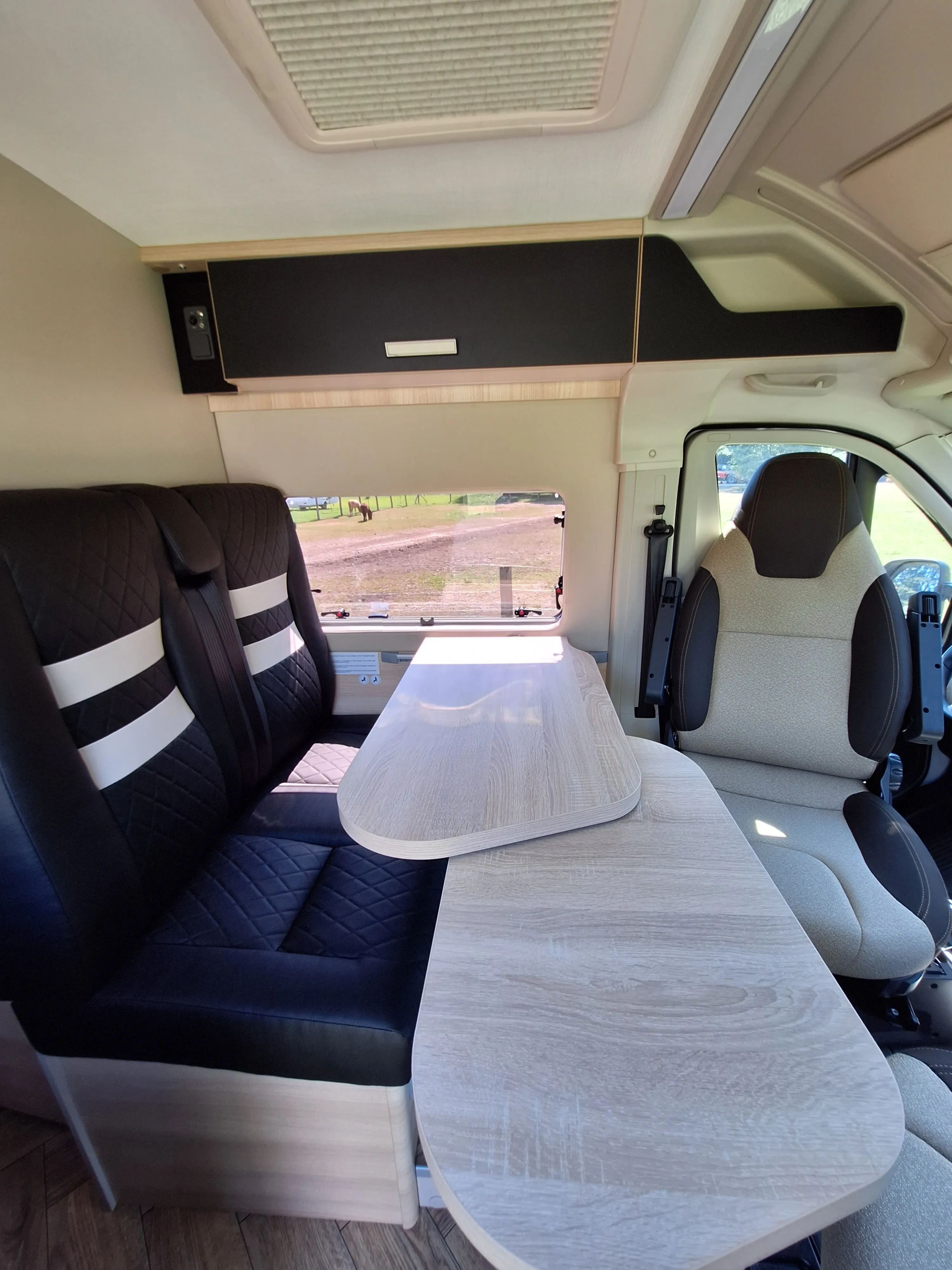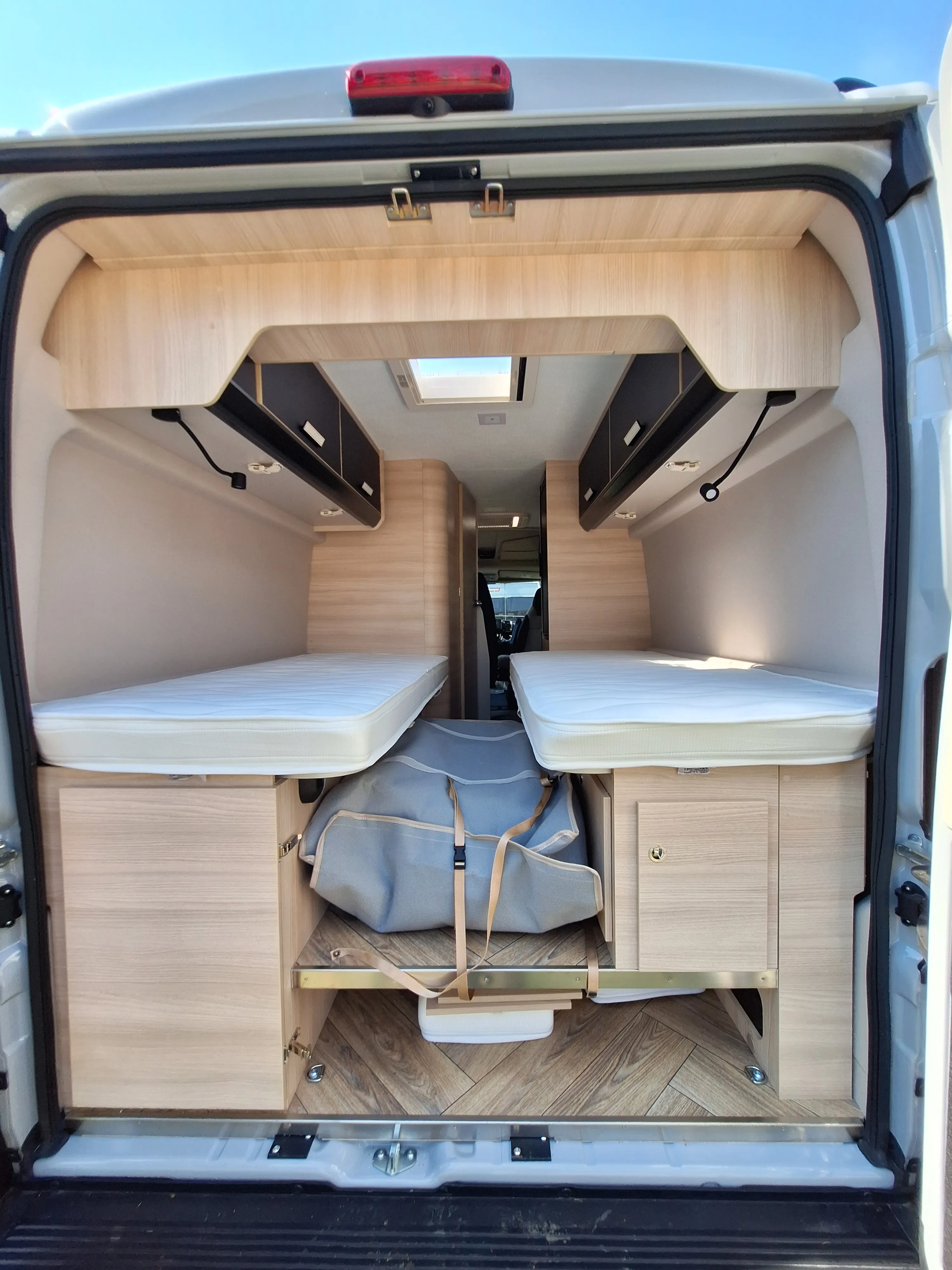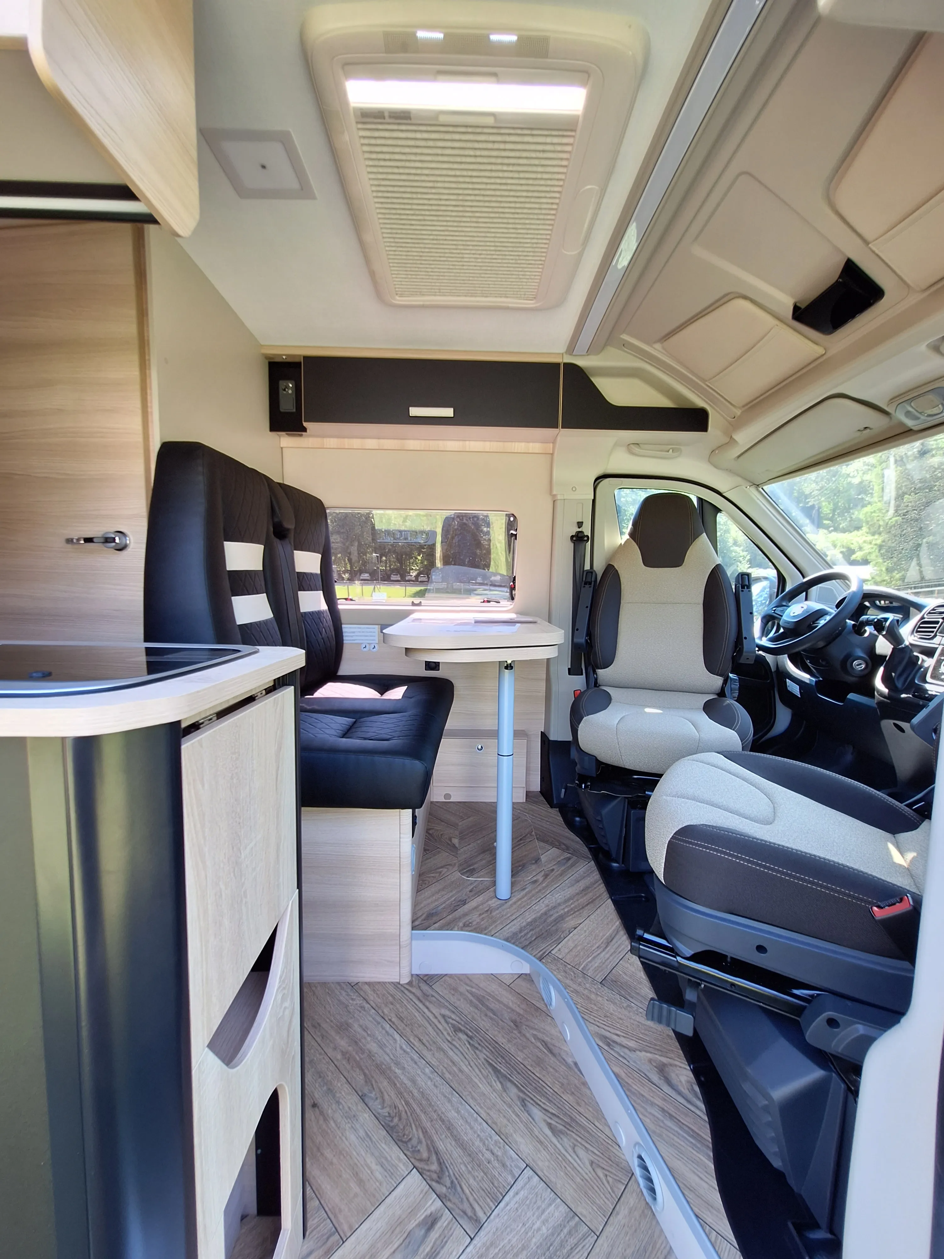 De camper heeft een standaard zithoek, waarbij de twee voorstoelen kunnen worden omgedraait, waardoor er plaats is voor 4 personen. Deze rondzit is eventueel om te bouwen tot een klein kinderbed door het verlagen van de tafel. Aan de achterzijde van de camper bevinden zicht 2 bedden in de lengte, waar een tussenstuk tussen kan om één groot bed te maken. Onder dit bed is de bergruimte, welke van buiten en binnen te bereiken is. De badkamer heeft een gecombineerde douche en toilet combinate, hoewel douchen in deze camper niet ideaal is. Het keukenblok is voorzien van een 85L koelkast, een 2-pits kookplaat en ladenkasten voor optimale bergruimte.