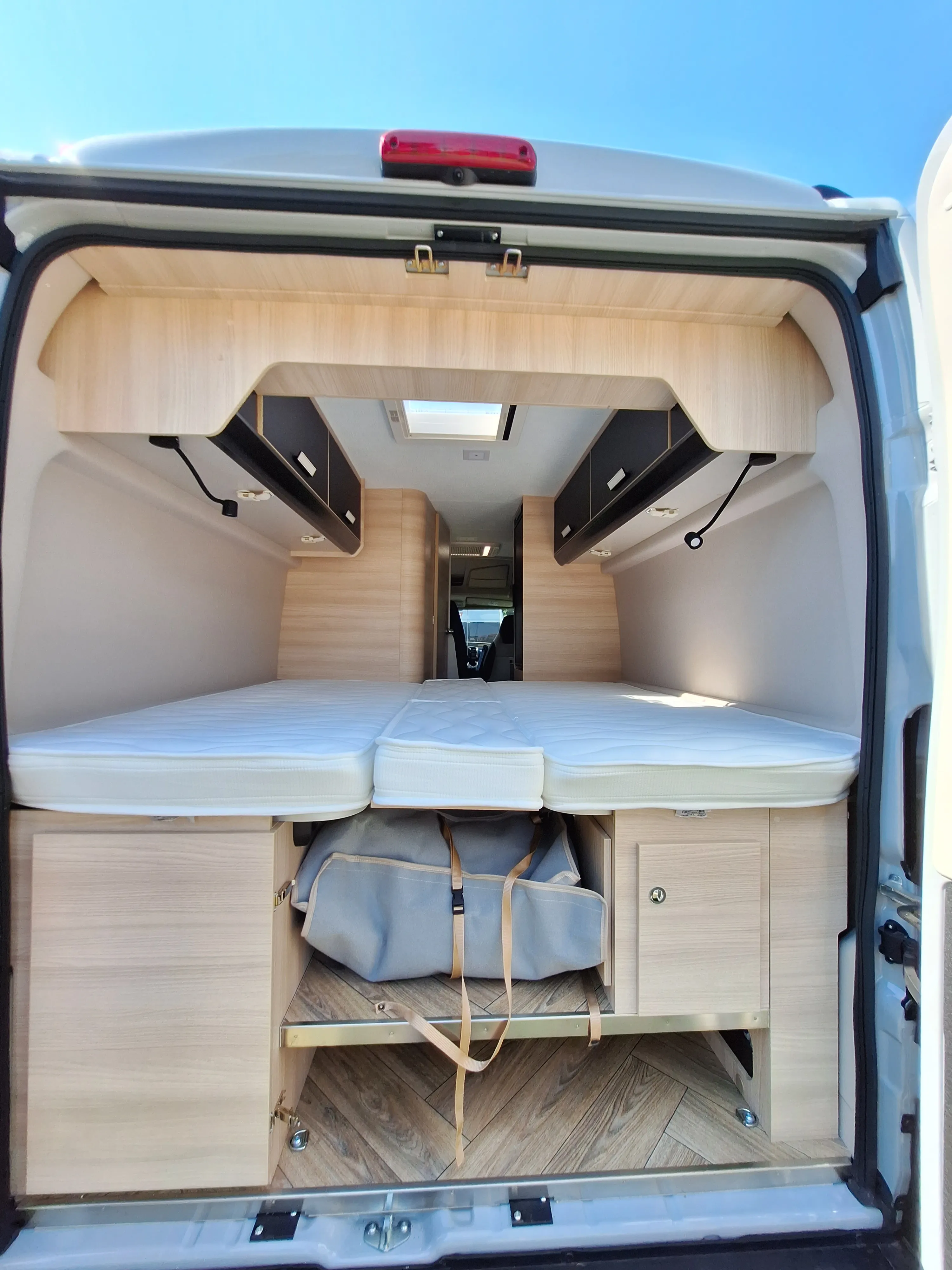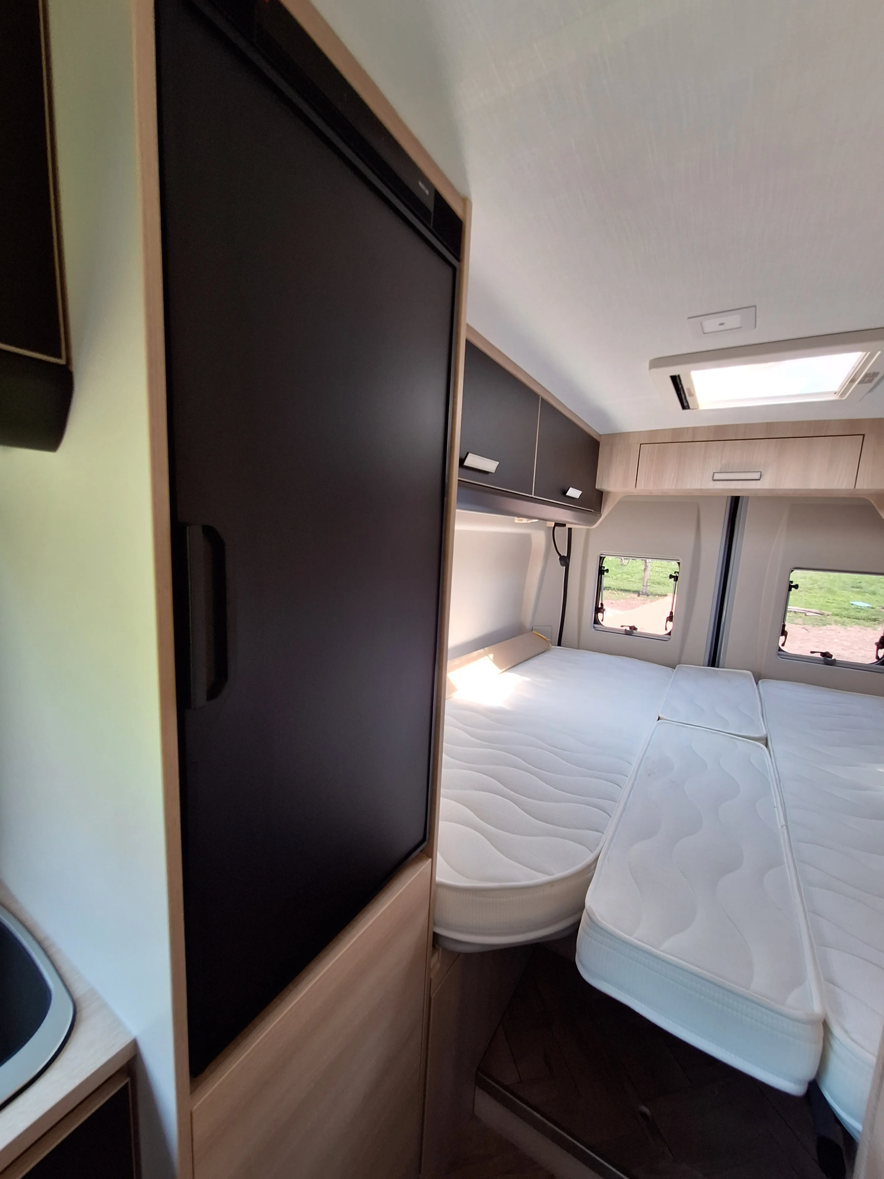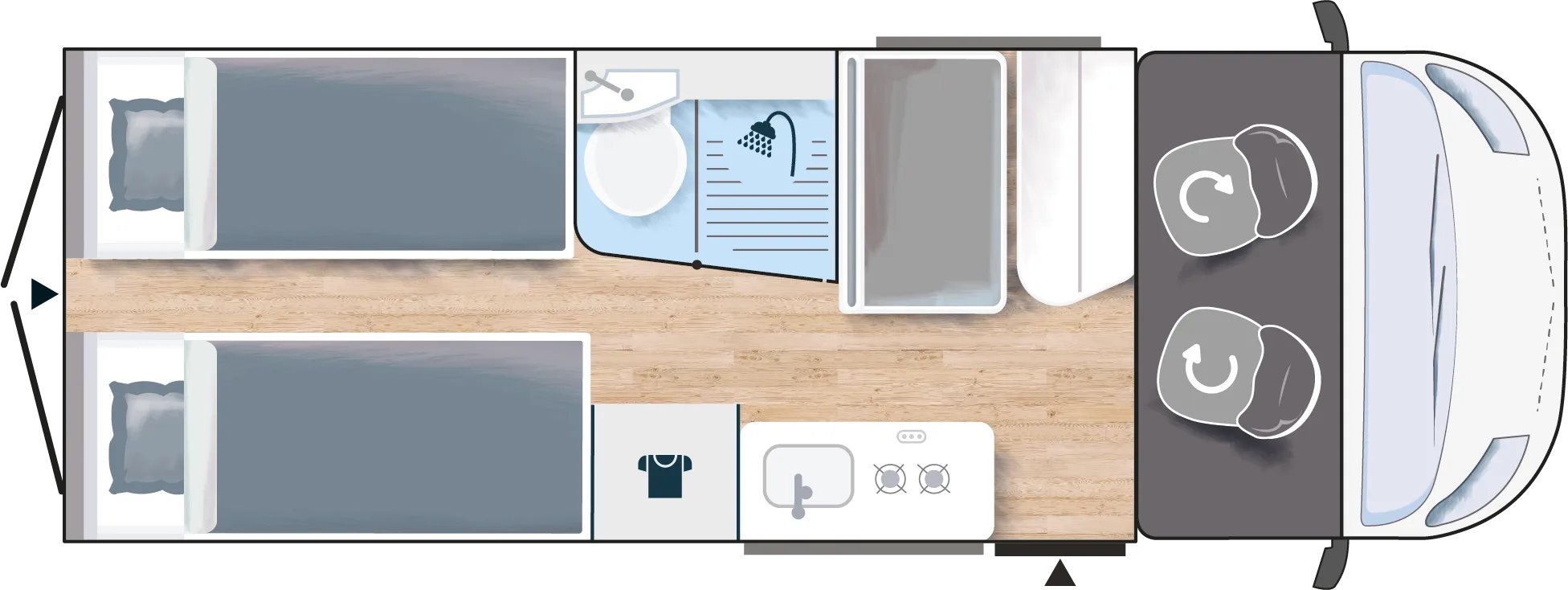 De camper heeft een standaard zithoek, waarbij de twee voorstoelen kunnen worden omgedraait, waardoor er plaats is voor 4 personen. Deze rondzit is eventueel om te bouwen tot een klein kinderbed door het verlagen van de tafel. Aan de achterzijde van de camper bevinden zicht 2 bedden in de lengte, waar een tussenstuk tussen kan om één groot bed te maken. Onder dit bed is de bergruimte, welke van buiten en binnen te bereiken is. De badkamer heeft een gecombineerde douche en toilet combinate, hoewel douchen in deze camper niet ideaal is. Het keukenblok is voorzien van een 85L koelkast, een 2-pits kookplaat en ladenkasten voor optimale bergruimte.
