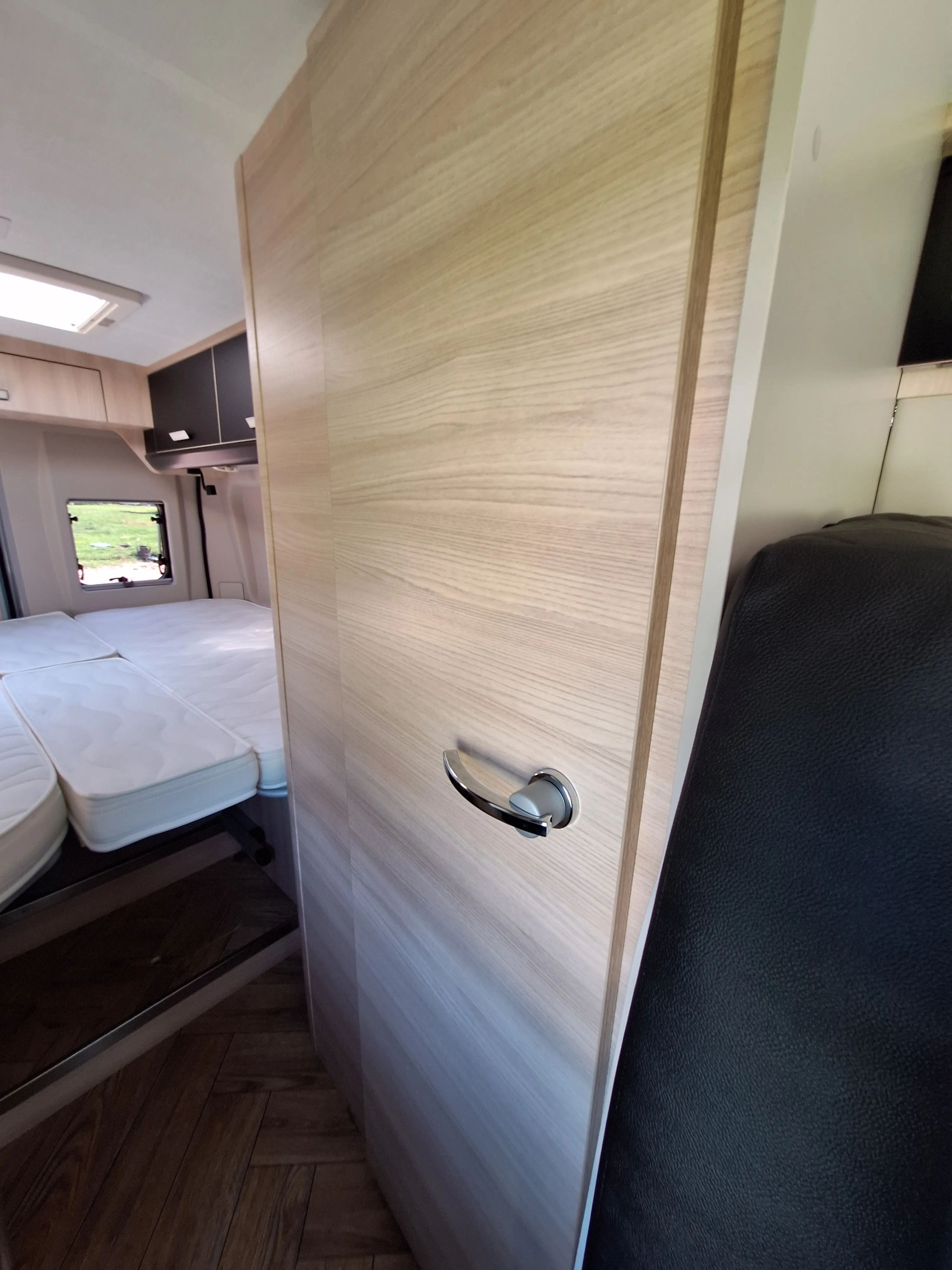 De V697 camperbus van Chausson heeft de sportiviteit van de het busformaat met de luxe van slapen in de lengte middels 2 lengtebedden, welke ook tegen elkaar kunnen tot één groot bed.